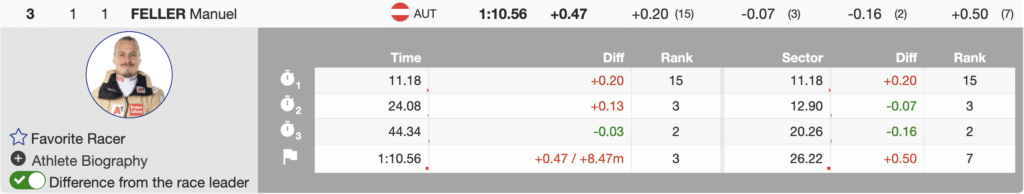 Feller managed to maintain his position against Croatian, Filip Zubcic, but as soon as the GS superstar and current leader of the World Cup Standings, Marco Odermatt came down he was pushed out of the lead by -0.42. Odermatt has won all five GS races this season and was not letting up on this hill.