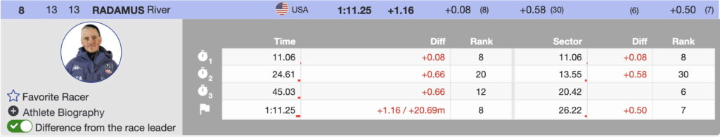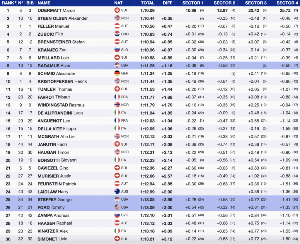 River Radamus of the Stifel US Ski Team completed the top-15 racers. He was running a solid, tight line, attacking the panels with eagerness. He came through the finish line +1.16 behind Odermatt’s lead.