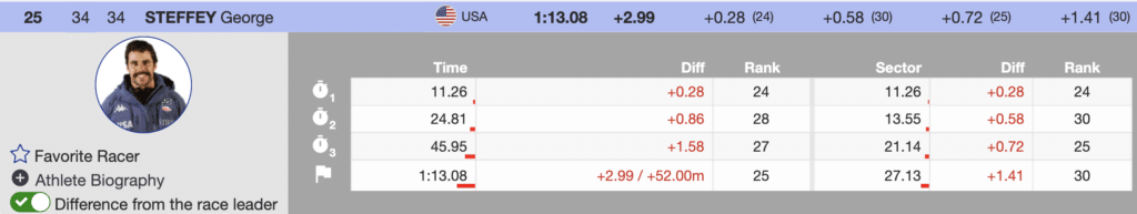 His teammate, George Steffey, put down a smooth run and came across the finish just 0.01 ahead of Ford. They finished with Steffey in 25th and Ford in 26th. They both aim to make up time in the second run.