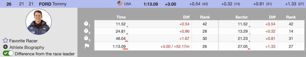 From beginning to end, Tommy Ford was striving to find more speed but was holding onto his edge a bit longer than needed, which was causing him to ski wider than most of the athletes before him. He came through the finish 3 seconds behind the leading time.