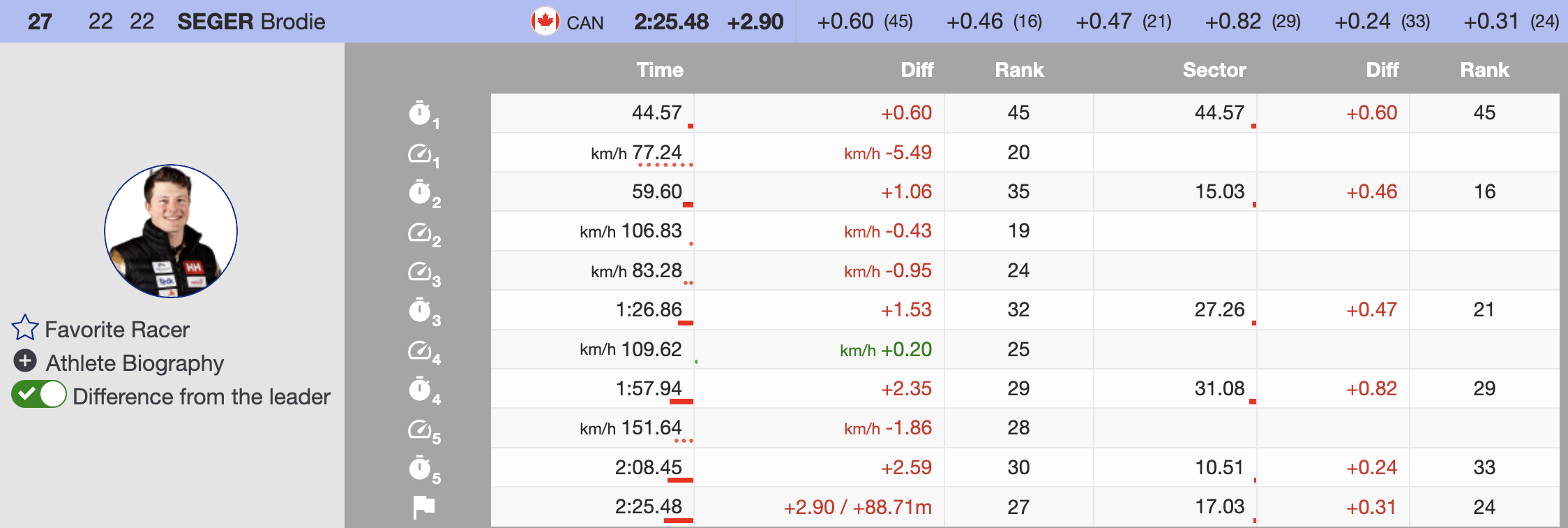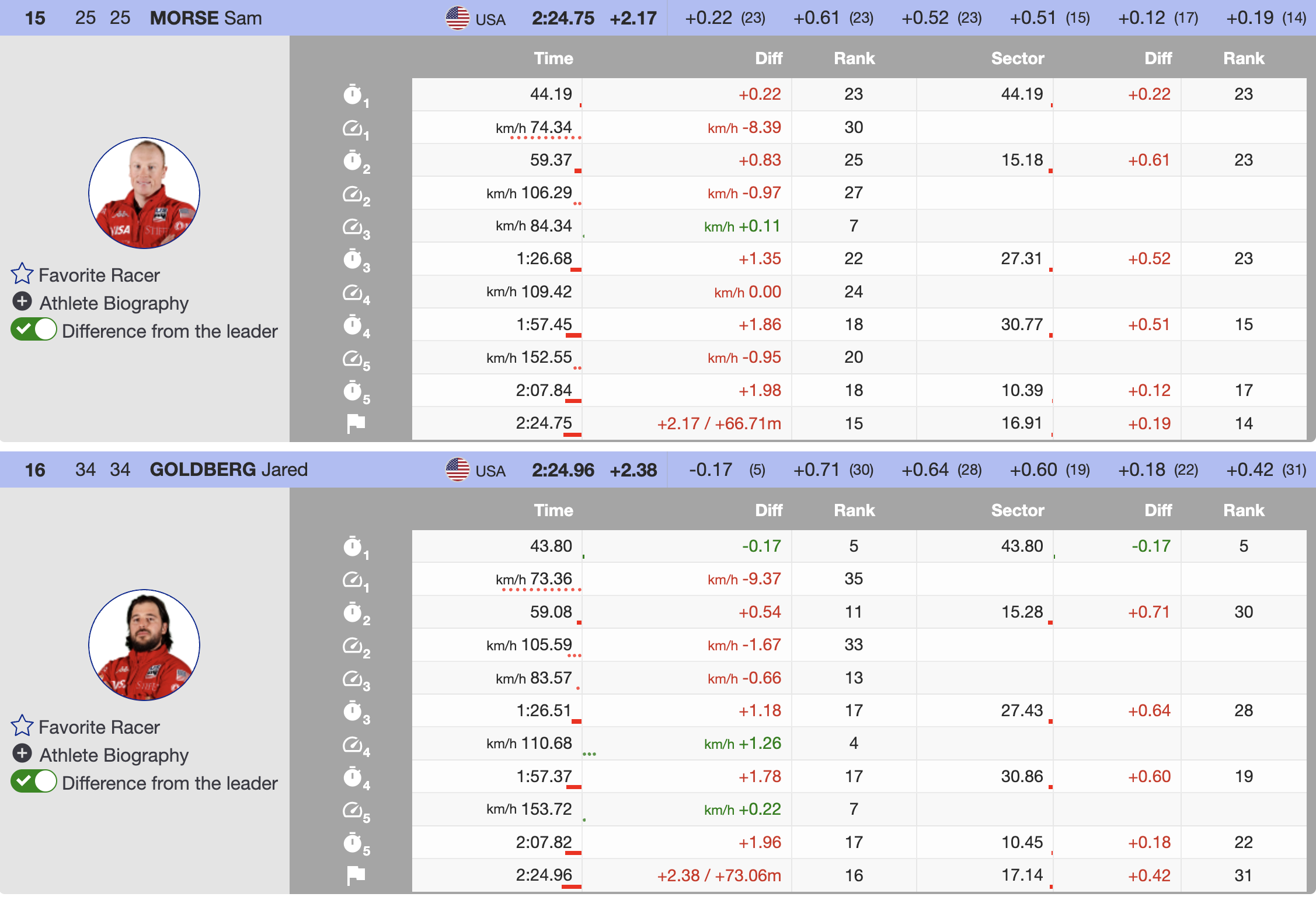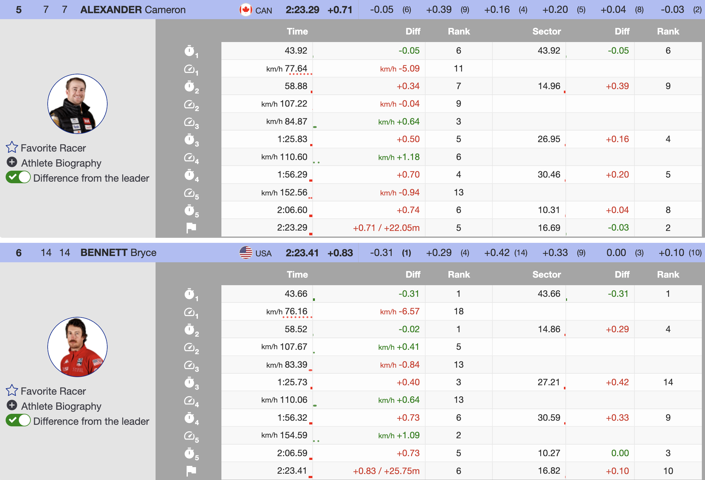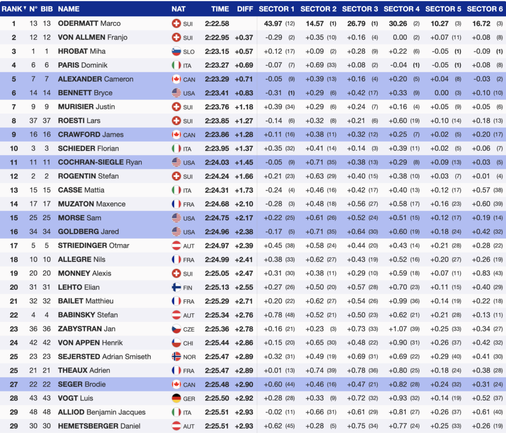 Immediately after Paris, Canada’s Cameron Alexander became the first North American to threaten the lead. Charging confidently through the sectors, Alexander ultimately finished 0.14 seconds off the pace, temporarily taking third place. Though he dropped to fifth by the end, Alexander remained the top North American finisher.