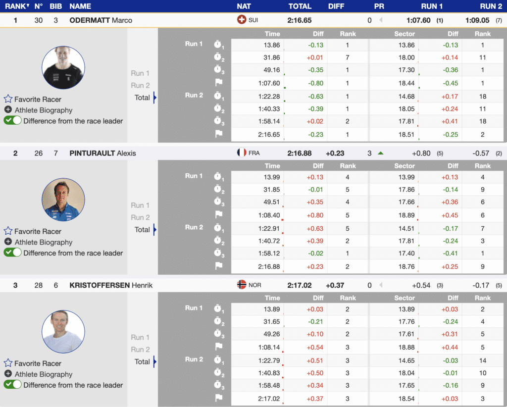 France’s Alexis Pinturault earned his first GS podium of this season. He delivered the second fastest final run moved up three positions to second place. Skiing that fast in the prevailing conditions while starting 26th is a significant accomplishment – it was a fantastic performance. Second in the GS season standings, Henrik Kristorffersen finished third but fell an additional 4o points behind Odermatt for the season discipline title.