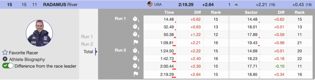 Stifel US Alpine Team member River Radamus skied well during his second run. Radamus moved up one spot and finished in 15th place.