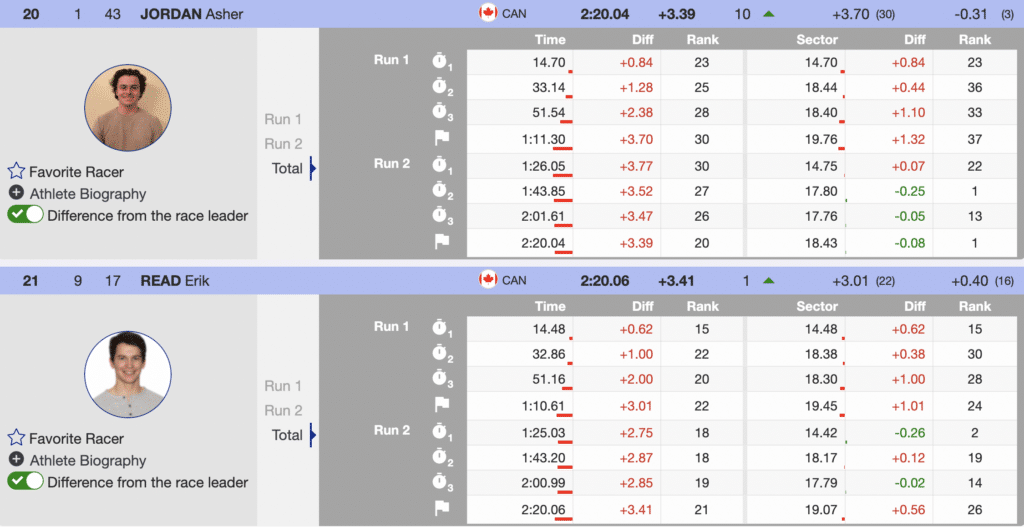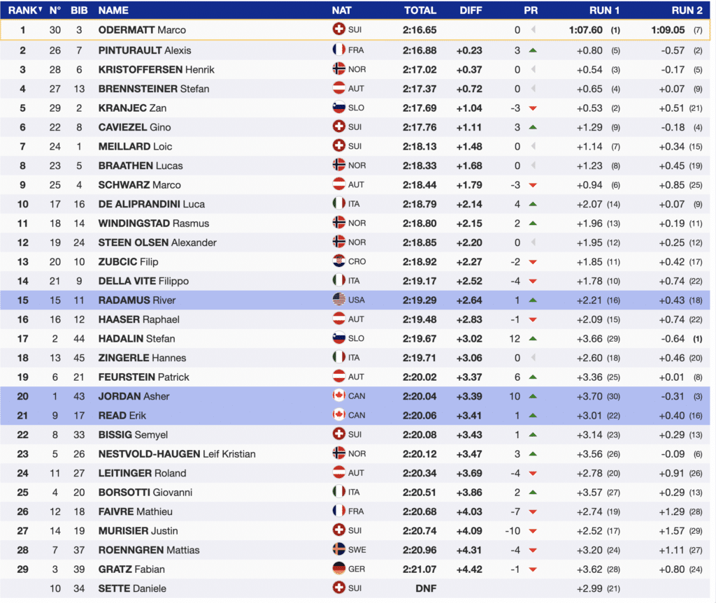 Taking advantage of his ideal start number first-time qualifier, Canadian Asher Jordan skied at a world-class level and finished the day 20th. He used the third fastest second run to move up 10 positions and score his first World Cup points. His teammate, veteran Erik Read ended the day 21st.
