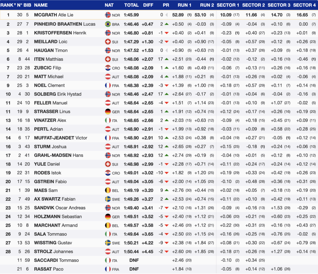 - Norway places three skiers inside the top four, reinforcing its depth in men’s slalom.