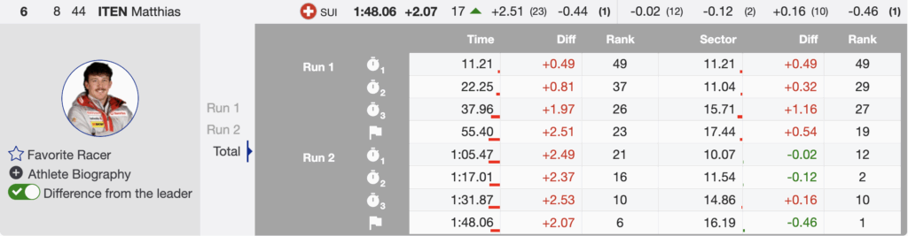 Reigning Olympic champion Clément Noël started with a significant first-run advantage over Iten but could not dislodge the Swiss leader, amplifying the tension with each sector.