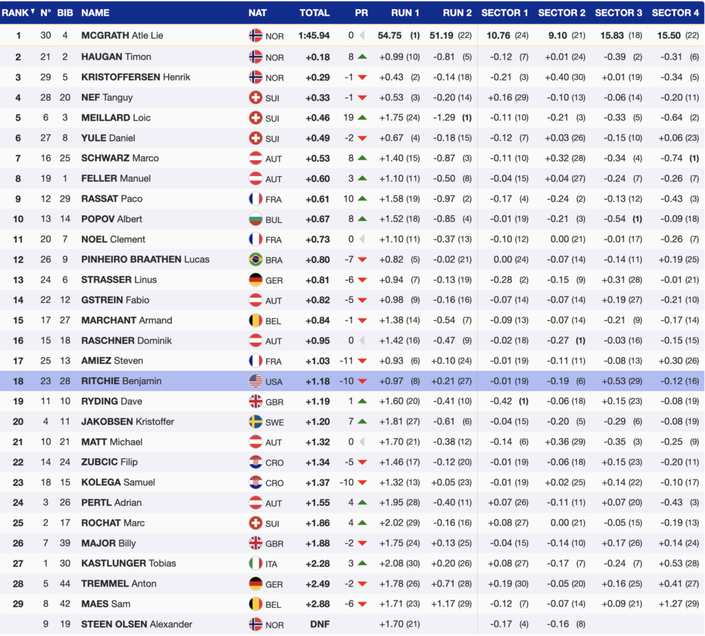 After the first half of the field had completed their second runs, Meillard remained firmly in the lead. France’s Paco Rassat held second place, just 0.15 seconds behind, while Bulgaria’s Albert Popov sat in third, delivering a strong performance to keep himself in contention.