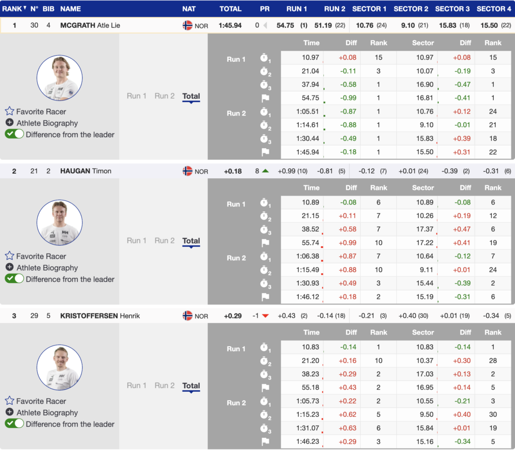 Confirming his earlier thoughts, Lie McGrath added: “This moment is truly unbelievable. At the start, I knew it was already a double Norwegian podium, and I felt a huge responsibility to make it a triple. To see the green light was a memory I’ll brag about to my kids someday. Sharing the podium with my teammates is something truly special, and feeling the energy from everyone here in Wengen made it even better. This is a day I’ll cherish forever.”