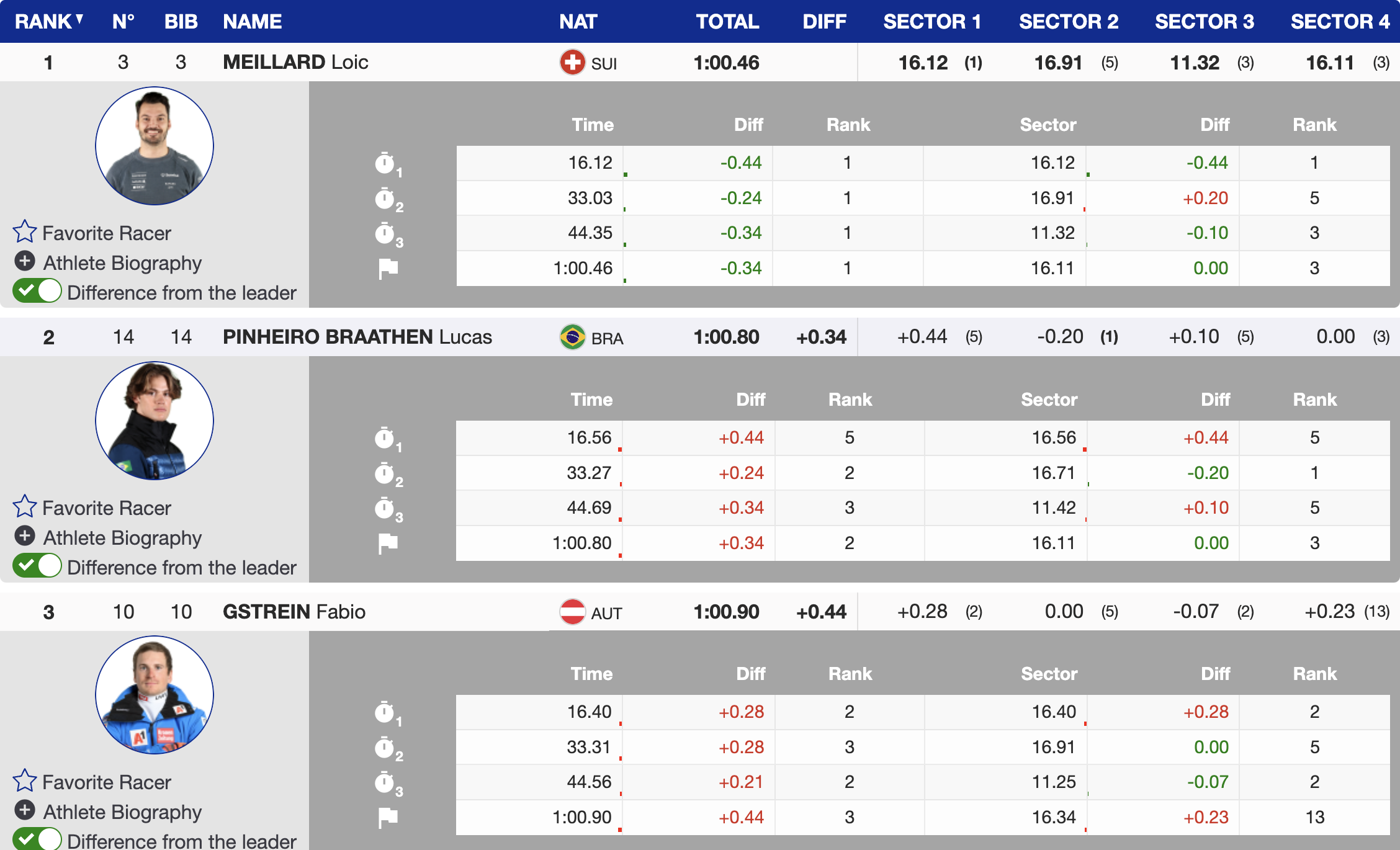 Austria’s Fabio Gstrein sits third, just 0.44 seconds behind Meillard, while France’s Clément Noël, a four-time winner this season and second in the slalom standings, is fourth at +0.52. The top five are separated by just over half a second, with Atle Lie McGrath (+0.53) and Norway’s Henrik Kristoffersen (+0.84) in the mix.