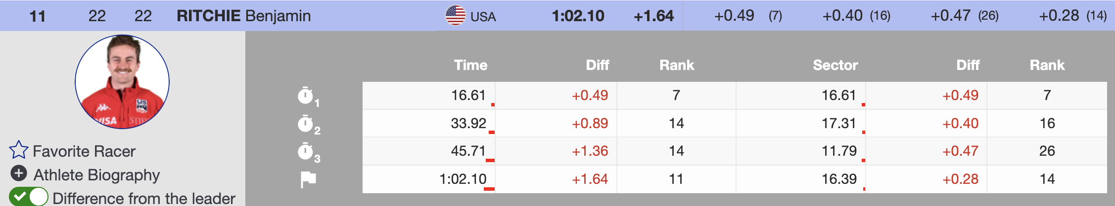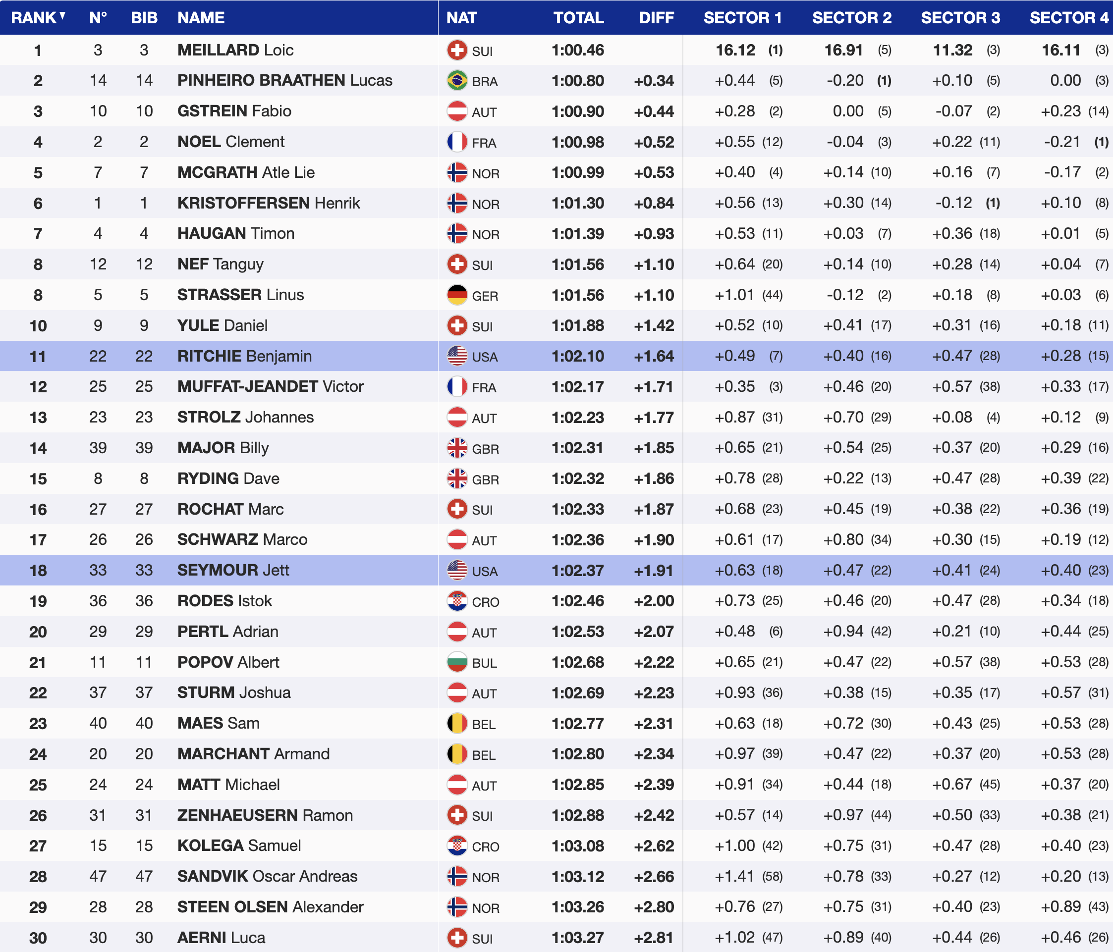 Two Stifel U.S. Ski Team athletes advanced to the afternoon’s second run: Ben Ritchie and Jett Seymour. Ritchie posted a strong first run to finish 11th (+1.64), keeping him within striking distance of a top-10 result. His quick first sector, ranking 7th, helped set up his competitive position.