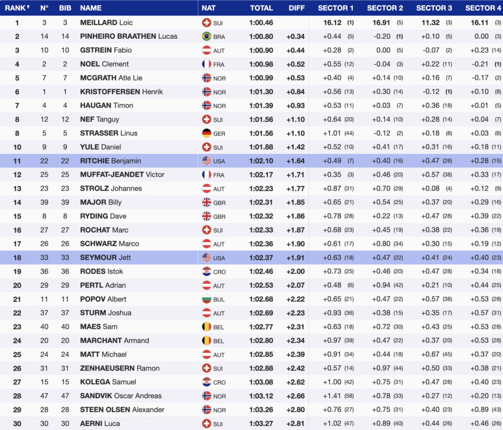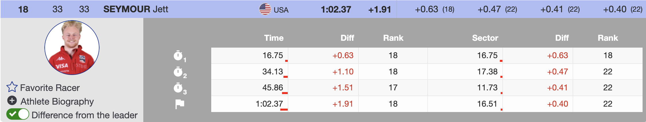 Seymour, starting with bib 33, delivered a determined run to place 18th (+1.91). His steady skiing throughout the long course ensured he stayed inside the top 30, earning him a final run in the last slalom of the regular season.