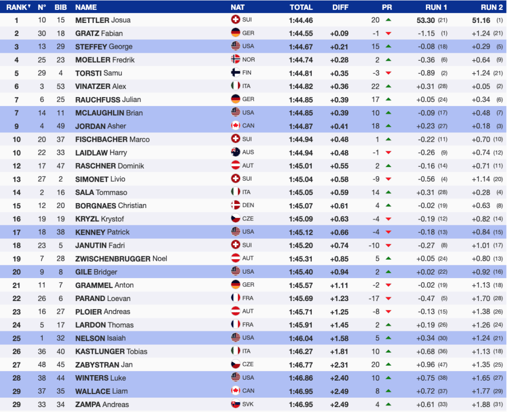 Seven US and two Canadian athletes competed in the race. All seven qualified for the second run. Notably, all of the North Americans but one finished in the top 30 and scored Europa Cup points. For the Americans, this GS series will act as the qualifier for either one or two of the US’s start quota spots at the December 10th Val d’lsere World Cup GS. Today, the USA had more athletes in the top 30, 20%, than any other nation and 27% were North Americans.