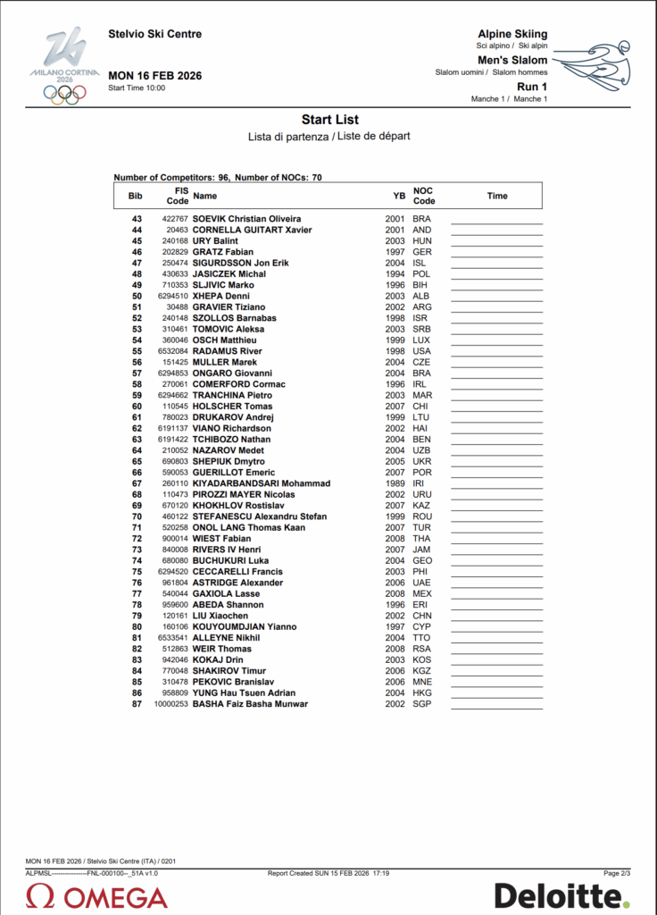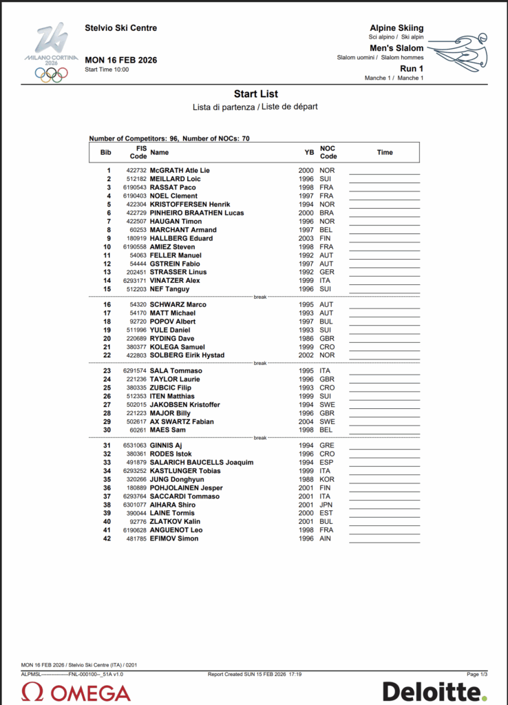 The start list is official. Ninety-six athletes from 70 nations will take on the Stelvio Ski Centre on Monday, Feb. 16, as the men’s Olympic alpine program in Bormio closes with what has been the most volatile discipline of the season: slalom.