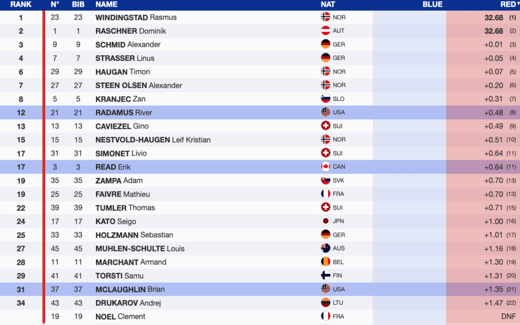 Only four of the World Cup’s top ten GS skiers chose to participate in the men’s parallel qualifier. Due to that reality, Slovenia’s Zan Kranjec’s, France’s Alexis Pinturault’s, and Germany’s Alexander Schmid’s advance to the Meribel finals were expected. But it was a surprise to see Switzerland’s Gino Caviezel miss qualifying by (+0.01)