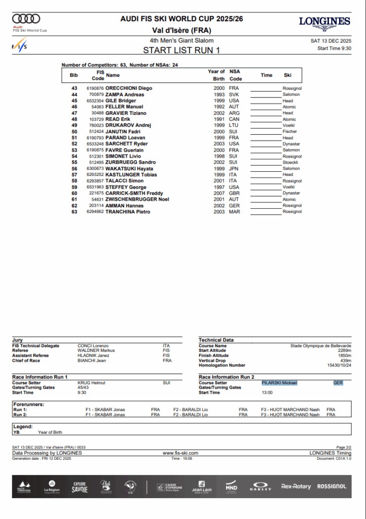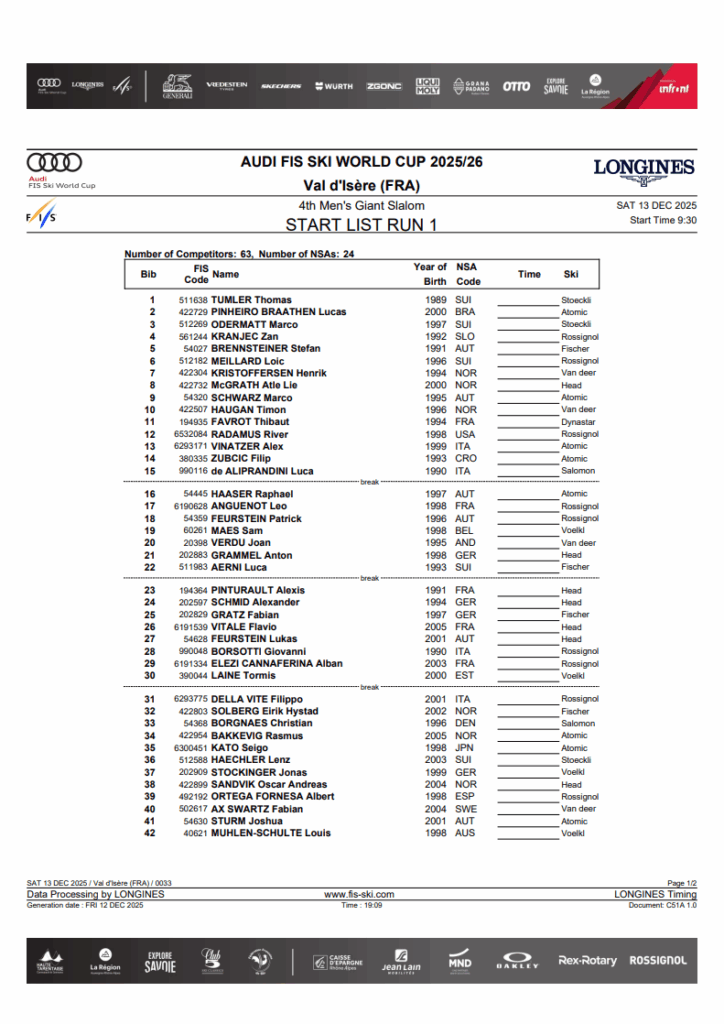 Marco Odermatt arrives in Val d’Isère with two victories from the first three giant slaloms, establishing early control in the discipline. Henrik Kristoffersen has matched that podium consistency, while Stefan Brennsteiner and Alex Vinatzer have already shown they can convert speed into results when conditions demand commitment.