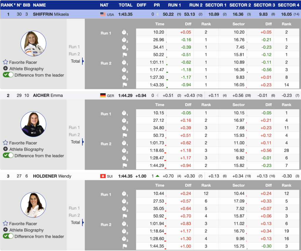 Second-place finisher Emma Aicher continued her breakthrough season with the best slalom result of her career, finishing just under a second behind Mikaela Shiffrin.