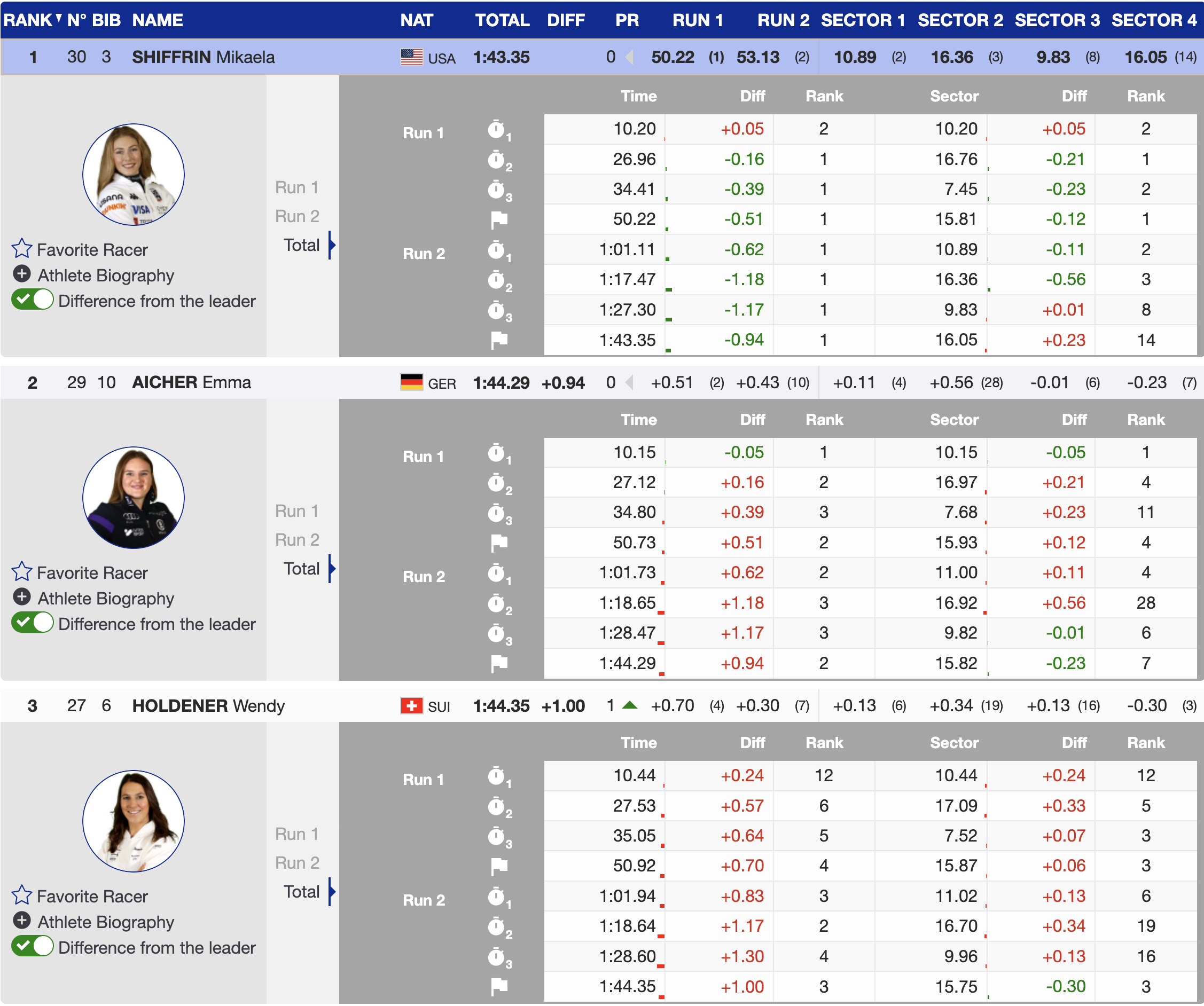 - 2nd — 🇩🇪 Emma Aicher (GER), Bib 10, 2003, Head — +0.94