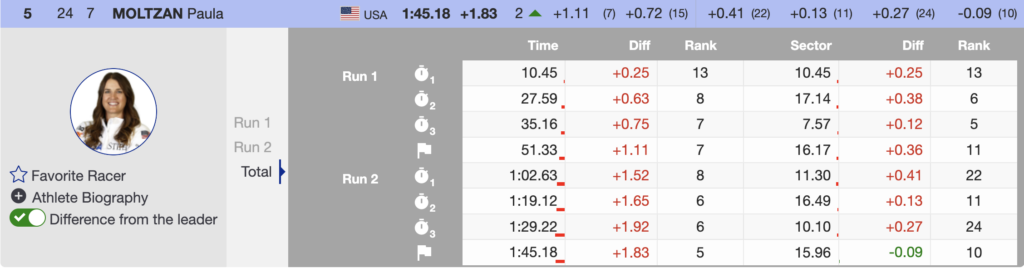 Paula Moltzan briefly took the lead despite several small mistakes, holding the advantage by just 0.02 seconds.