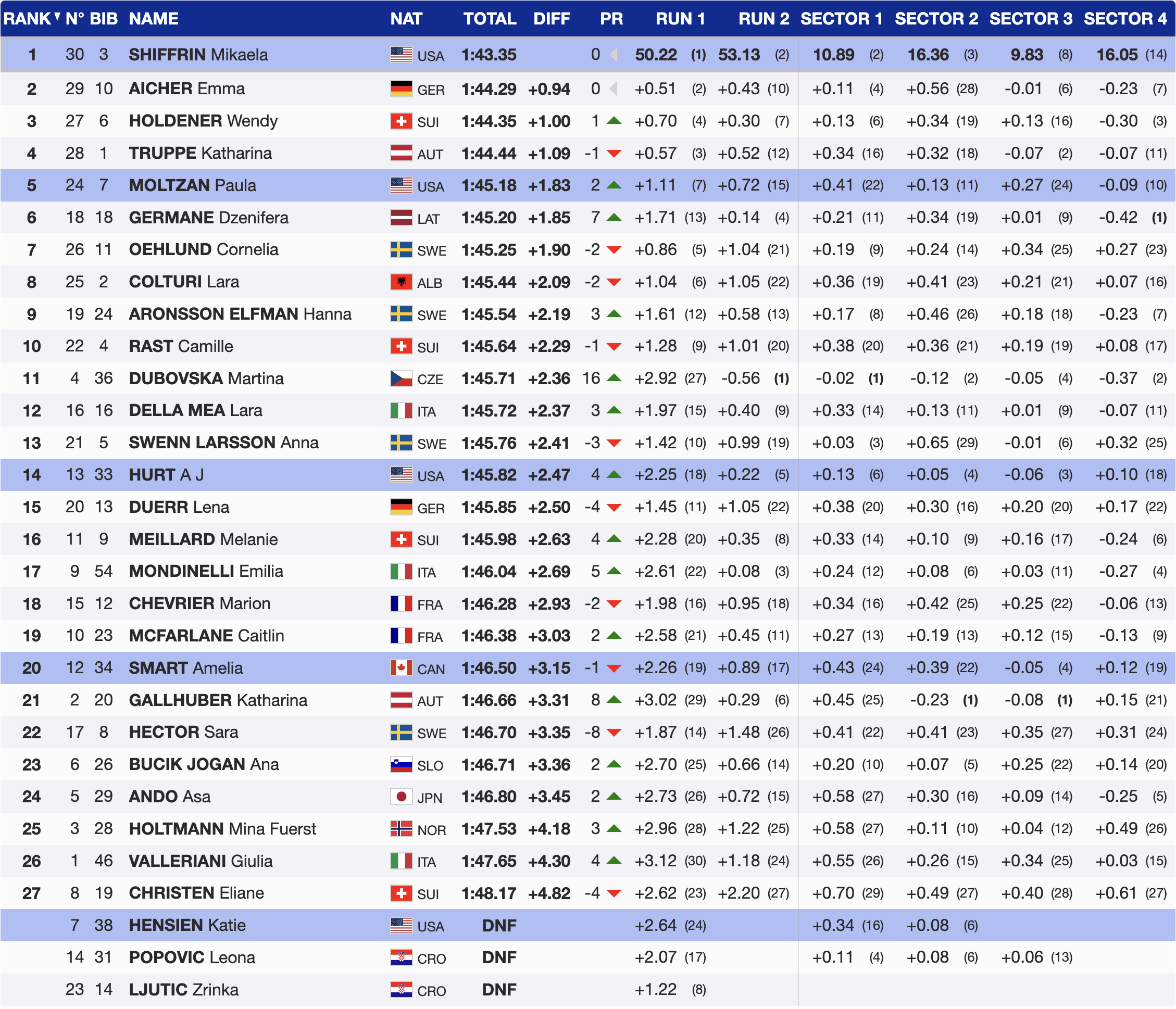 - 1st — 🇺🇸 Mikaela Shiffrin (USA), Bib 3, 1995, Atomic, Oakley — 1:43.35