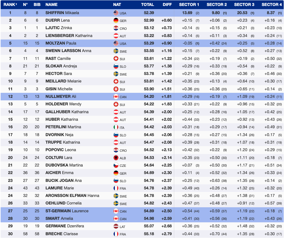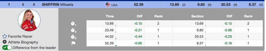 The eight-time slalom globe winner showed full-throttle and focused skiing. She kept her foot on the gas all the way through the finish line, dominating with a stellar lead, -0.60 ahead of the competition. This will be a challenging benchmark to beat if she keeps up the momentum in the second run.