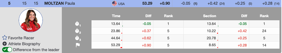 Stifel U.S. Ski Team athlete Paula Moltzan rounds out the top-5 athletes heading into the second run. Moltzan pushed out of the start gate, ready to give it her all. She was screaming through the top gates, establishing a lead in front of Shiffrin coming onto the pitch.
