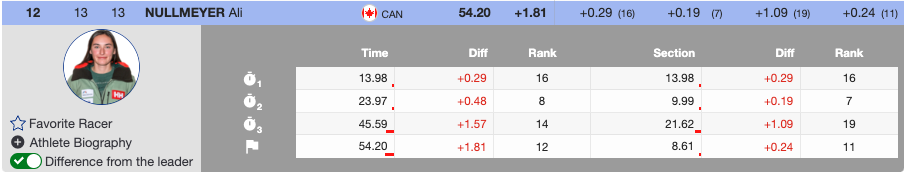 Alpine Canada Alpin Ali Nullmeyer was the third-top North American after the first run. She pushed hard out of the start gate and came fast onto the pitch. However, she slightly over skied the pitch, which lost her time coming into the course’s final section.