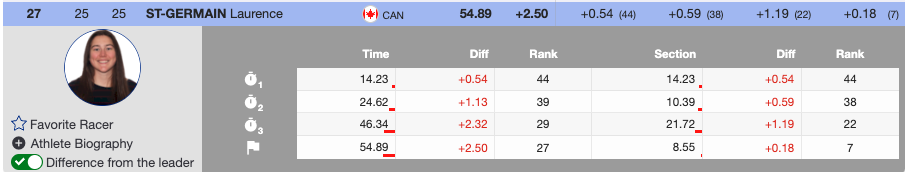 The other Canadian athletes, Amelia Smart and Laurence St.Germain, squeezed into the top 30, qualifying for the second run. St.Germain concluded the first run +2.50 behind the lead, and Smart trailed slightly behind her +2.59 off the lead.