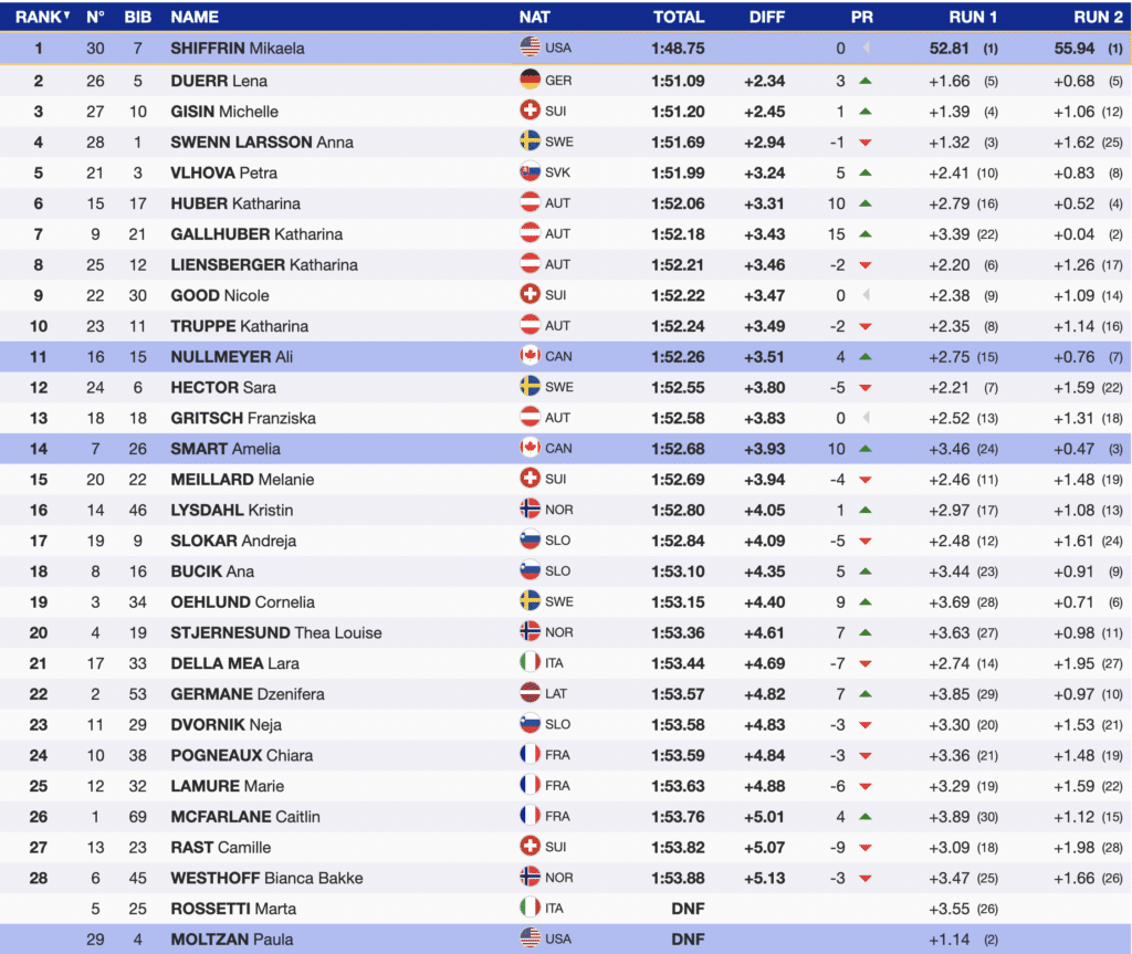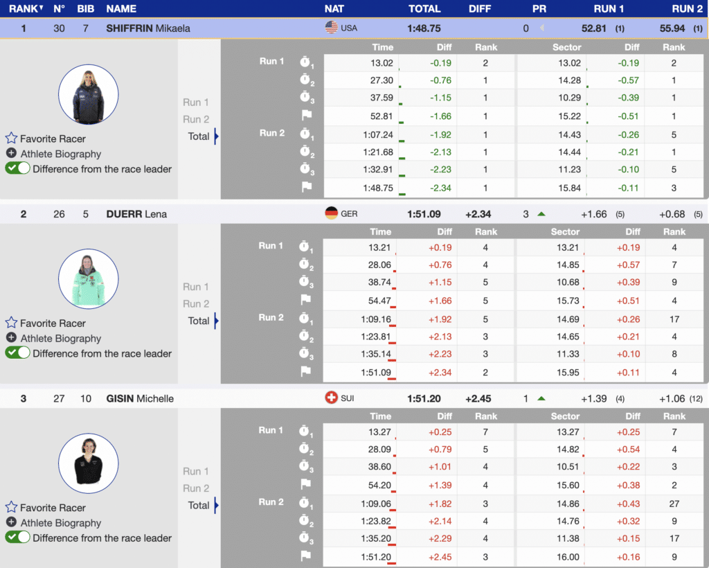 It has been said many times, but the day belongs to Mikaela Shiffrin. She destroys the field and again shows the world she is not done being the best. It is her 93rd career World Cup victory, her 56th in slalom, and her 5th of the season. She ends the day with a (-2.34) advantage over second-place German Lena Duerr.
