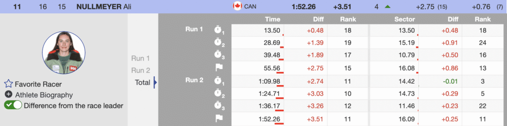 However, her teammate Ali Nullmeyer was 15th after the morning; although she did not cross the second run finish with the lead, Nullmeyer moved up four positions to end the day 11th.