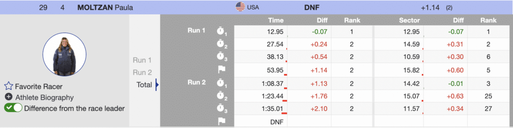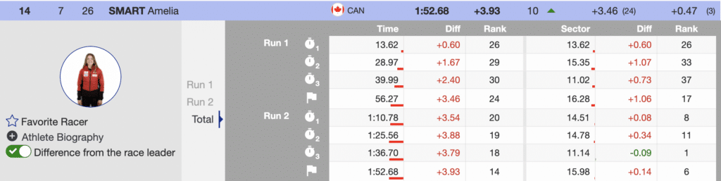 Although Canada’s Amelia Smart did not deliver her best skiing in the morning edition, seeing her take advantage of her early start, ski very well, and earn (-0.47) lead when she crossed was exciting. During the afternoon, Smart gained ten positions and finished a season-best 14th. Smart was the third fastest on the second run.