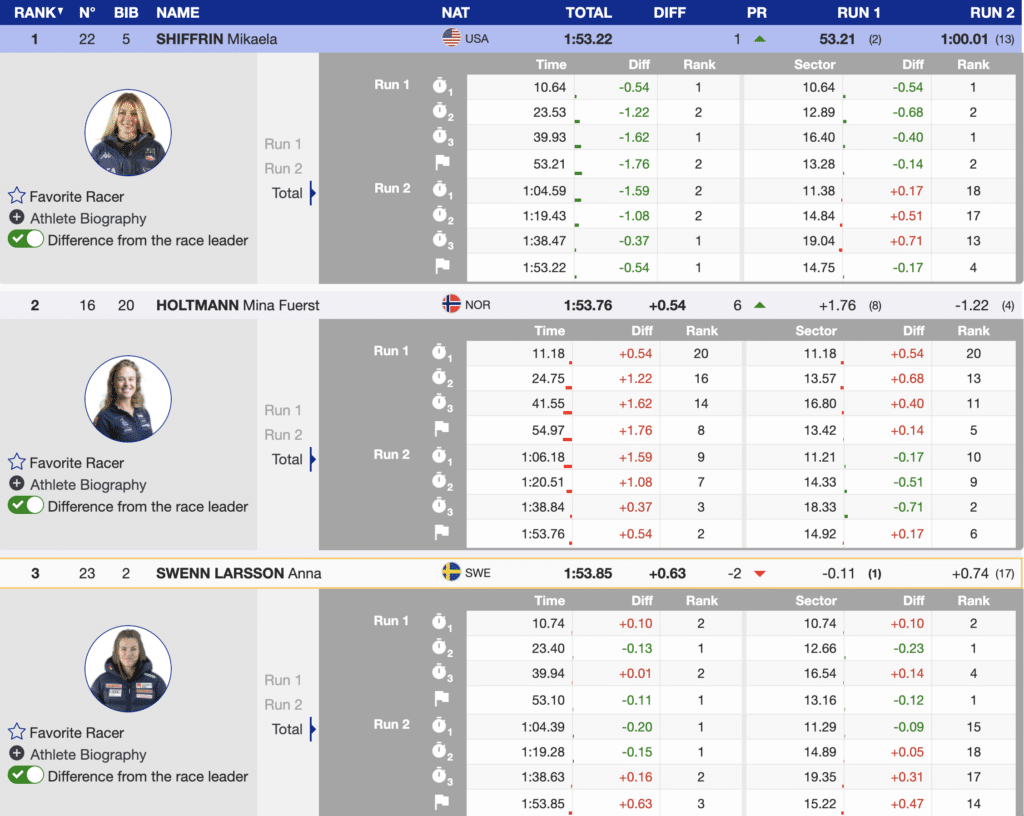 The next to ski was the Croatian Zrinka Ljutic, who skied off-course and did not finish. At that point, Holtman was guaranteed a podium. However, the most successful slalom skier in history was next to race. Shiffrin is so successful because she works hard and is amazingly talented. She took a (0.54) lead. That left only the first-run leader, Swenn Larsson, at the start. However, Swenn Larsson finished third.