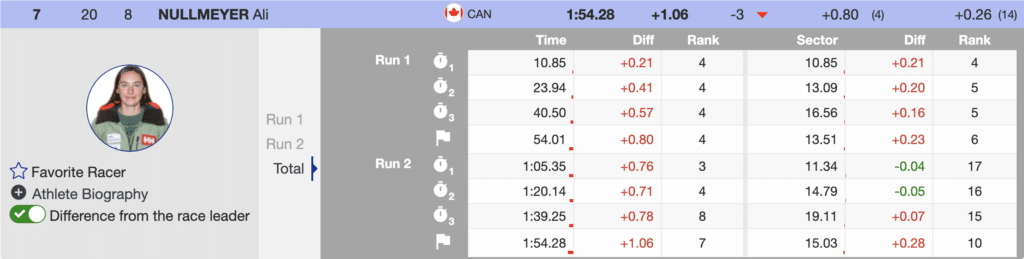 The final four women of the day were all within a second of each other after the first run; the first to ski was Canada’s Ali Nullmeyer. When she started, Holtmann had a (0.13) lead. However, Nullmeyer crossed the line well back of the leaders and finished 7th. That kept Holtmann and Dvornik in the top two positions.