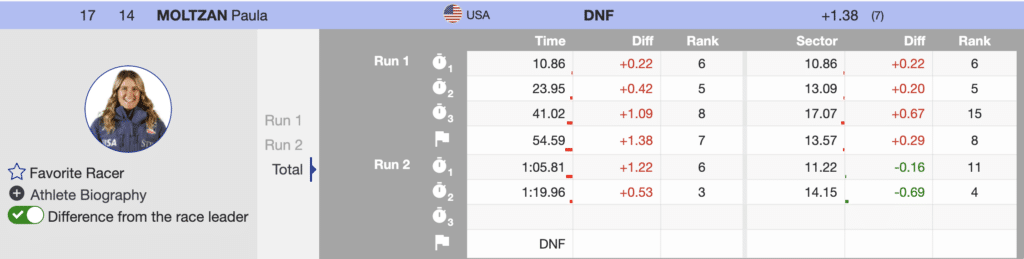 Unfortunately, Stifel US Ski Team’s Paula Moltzan, seventh after the first run, straddled while skiing well and did not reach the finish.