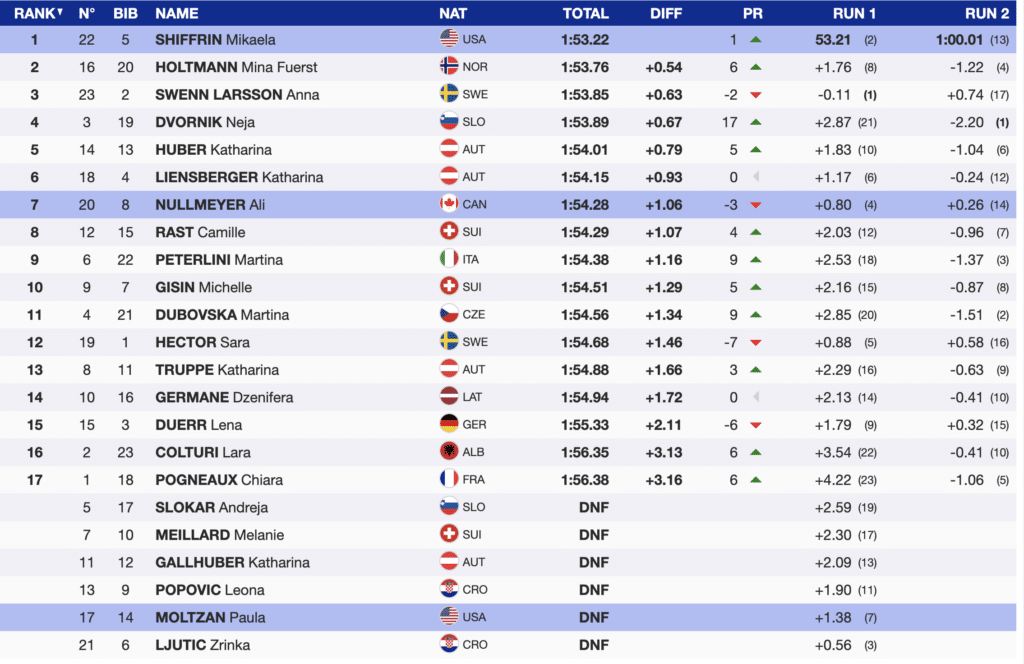 Notably, Canadian Ali Nullmeyer, 4th after the first run, ended the day in 7th. Nullmeyer ends the season with an exceptional four top-ten slalom finishes. She ended the slalom season ranked 11th.