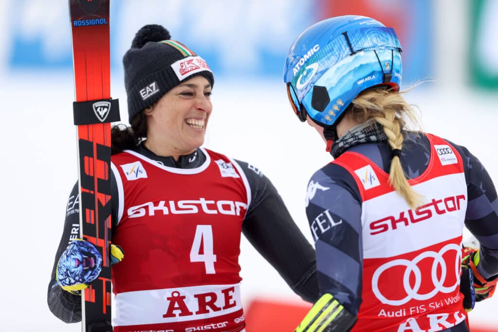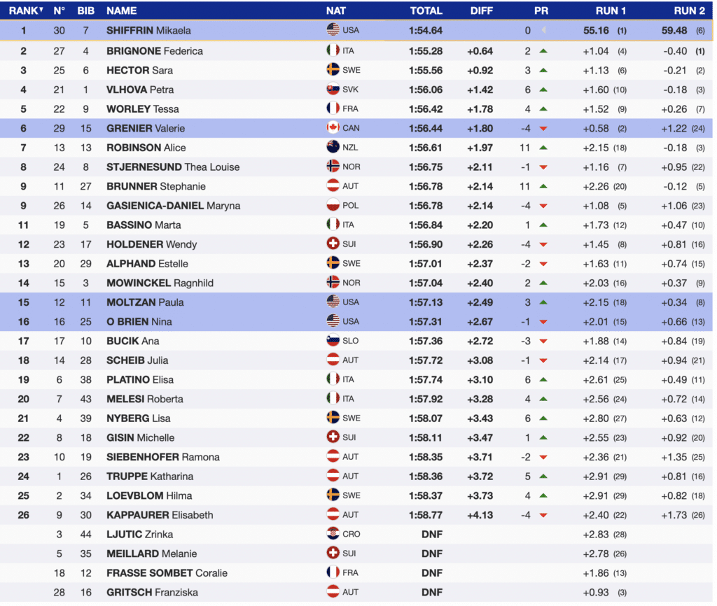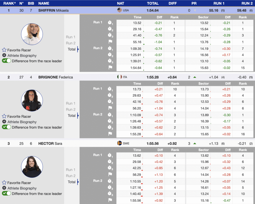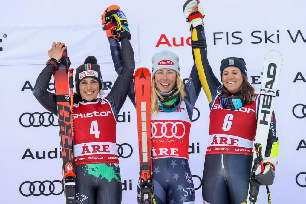Joining Shiffrin on her historical podium is Italy’s Federica Brignone (+0.64) in second and home country hero Sweden’s Sara Hector (+0.92) in third.