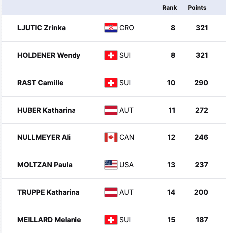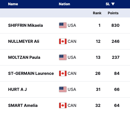 Joining her in the top 15, Canada’s Ali Nullmeyer holds the 12th position, showcasing her strength on the World Cup circuit and adding depth to Alpine Canada Alpin’s roster. Additionally, Paula Moltzan, another standout from the Stifel US Ski Team, sits within this elite group, capturing an impressive third-place finish at the Soldeu, Andorra slalom last February.