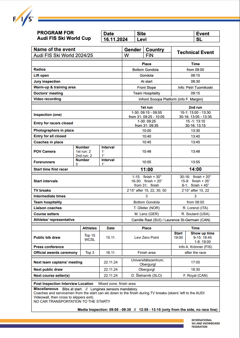 The 2024-25 FIS Alpine Ski World Cup Slalom season opens in Levi, Finland, on Saturday, November 16. Situated 170 kilometers above the Arctic Circle, Levi traditionally starts the Women’s World Cup Slalom calendar, known for its stunning race hill illuminated by powerful lights. With sunrise at 9:37 a.m. and sunset at 2:33 p.m., race day brings just under five hours of daylight, though the course remains brightly lit, adding to the dramatic atmosphere.
