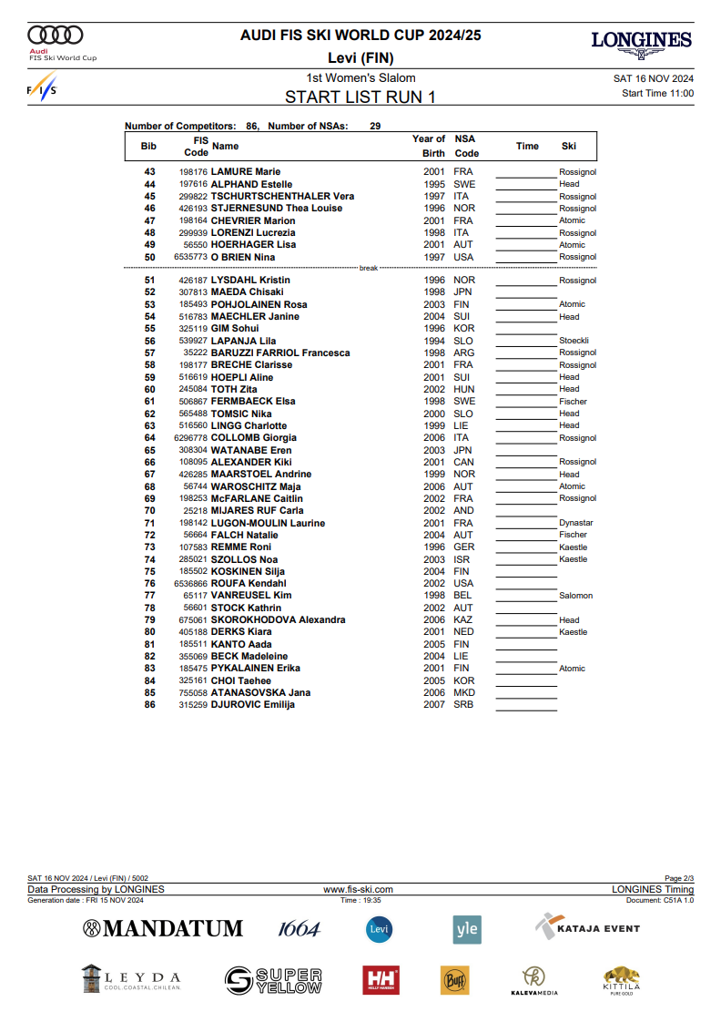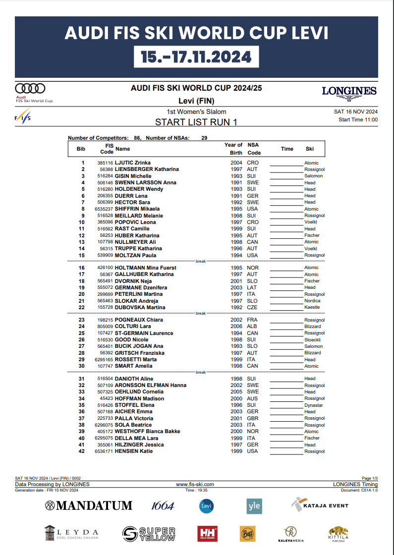 Eighty-six women from 29 nations will start the women’s World Cup SL in Levi on Nov. 16. Switzerland and Austria entered the most athletes, with both countries fielding eight competitors.