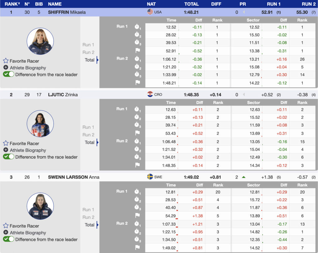 Second-place Croatian Zrinka Ljutic is only 19, but she skis with the poise of a veteran. Ljutic started the second run with a (+0.52) disadvantage, but also as the only racer within a second of Shiffrin. She delivered a fantastic run and ended the day just (+0.14) from tying for a victory.