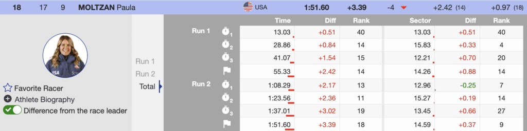 The next Stifel US Ski Team racer to ski was Paula Moltzan. Moltzan was 14th fastest after the first run but made an uncharacteristic mistake during the second and crossed the finish into 5th place. She moved back four positions and finished the day 18th (+3.39).