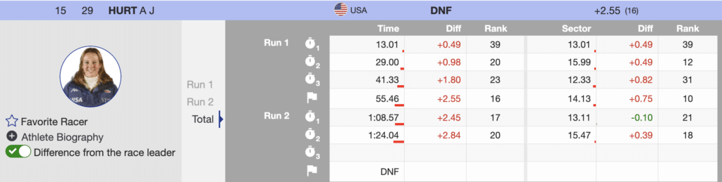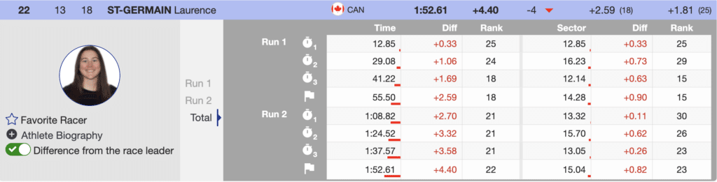 It was a pleasure to see Canada’s reigning World Champion, Laurence St-Germain, return to racing. She suffered an ankle injury after Killington; this was her first race back. She qualified for the final run and finished on the 22nd (+4.40).