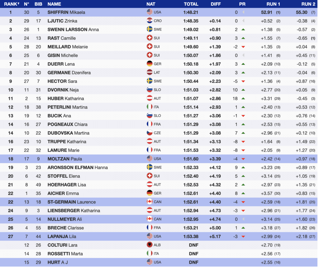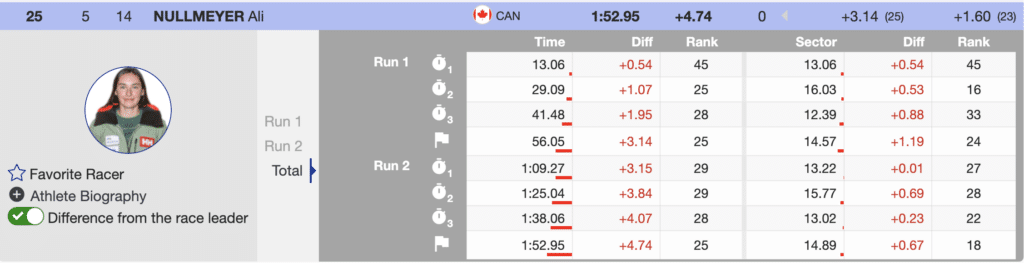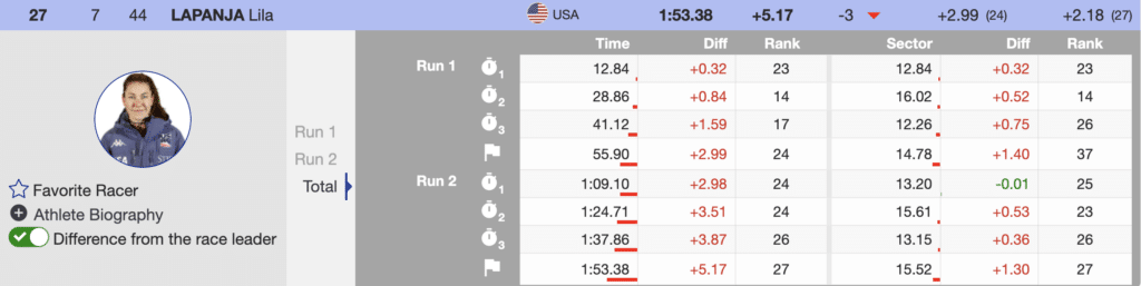 The first two North Americans to ski the afternoon course were Canada’s Ali Nullmeyer and US independent SYNC team member Lila Lapanja. Both women struggled to find their speed. However, both finished Nullmeyer was 25th (+4.74), and Lapanja dropped three positions during the last run and finished 27th (+5.17). However, the four points Lapanja earned were her first of the season.