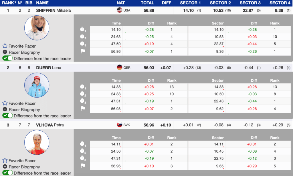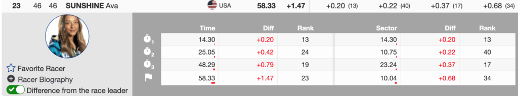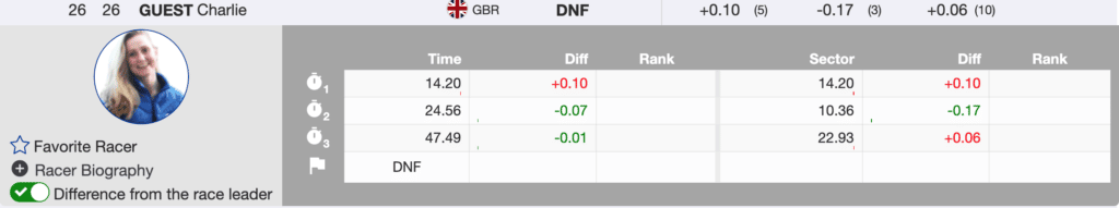 Notably, before going out, British skier, Charlie Guest, was leading with only one split to the finish. Guest is working with Reini Fernsebner this season, and it appears to be working. Although she skied out both days in Levi, the current evidence reveals she will be one to watch.