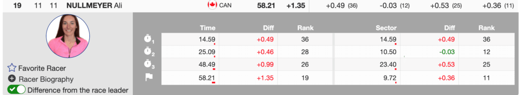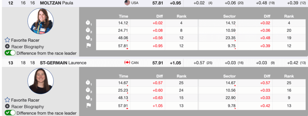 Twenty-two athletes did not finish the first run. The North American Women on that list include US athletes Zoe Zimmermann, Nina O’Brien, and Canadian Kiki Alexander.