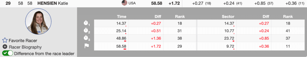 Ten women from outside the 30 on the start list qualified for the second run. Yesterday’s rookie of the race, USA’s Ava Sunshine, did it again, qualifying 23rd with bib 46. Also, USA’s Katie Hensien started with bib 58 and, skiing fast, completed the first run in 29th position. However, France’s Marie Lamure skiing immediately after Sunshine skied into 13th.