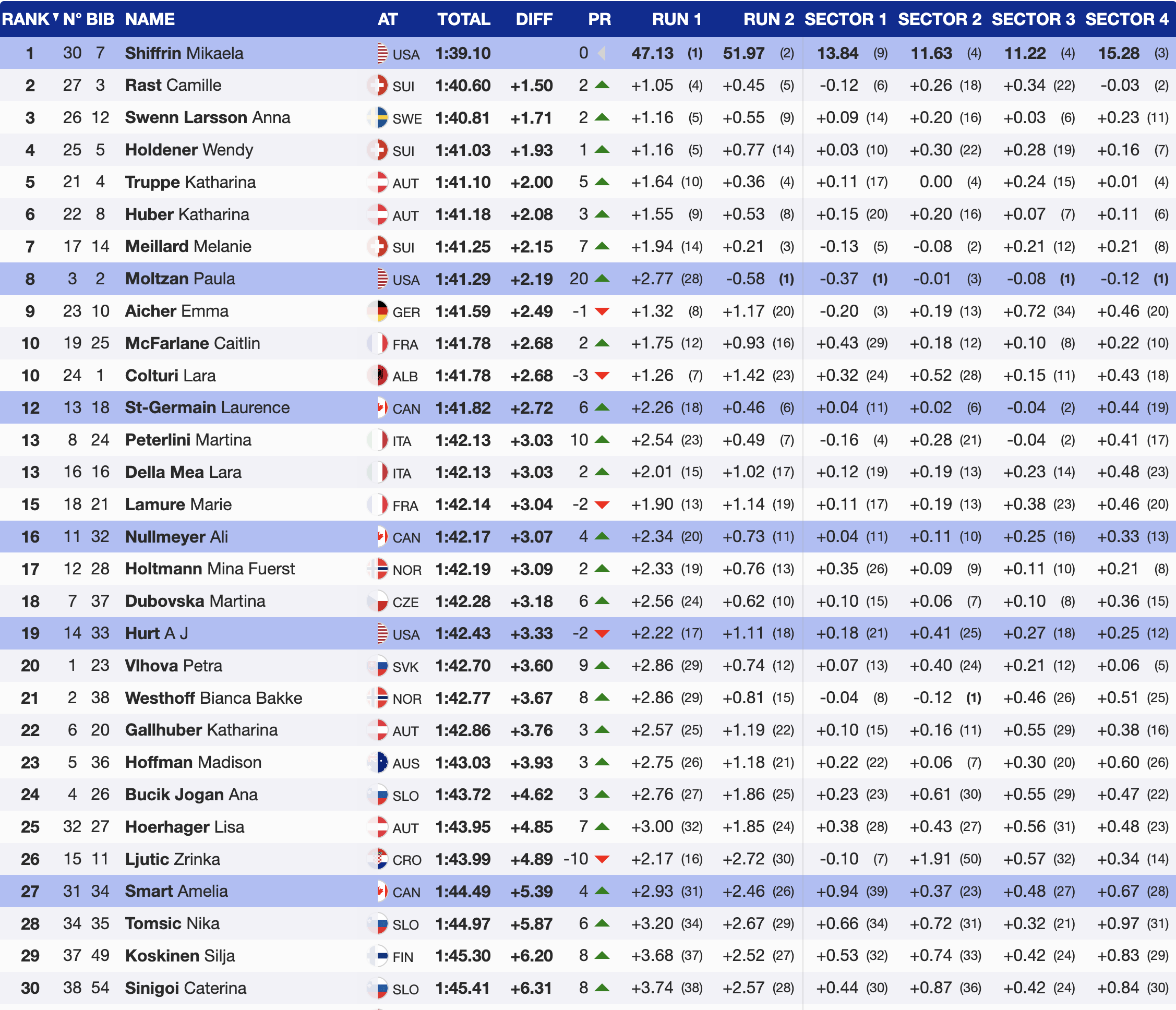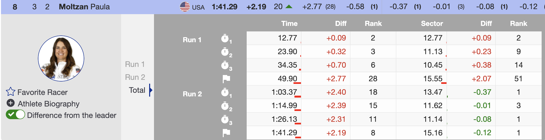 Moltzan produced one of the most impressive second runs of the entire Olympic slalom. After major mistakes in the first run left her 28th and barely inside the flip, she attacked from third in the second run and immediately set the standard.