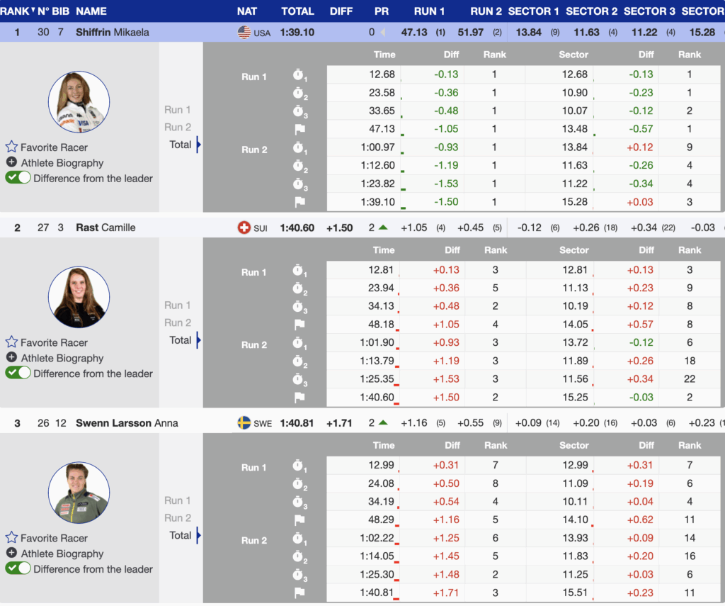 - 🇺🇸 Mikaela Shiffrin (1995) — Gold — 1:39.10