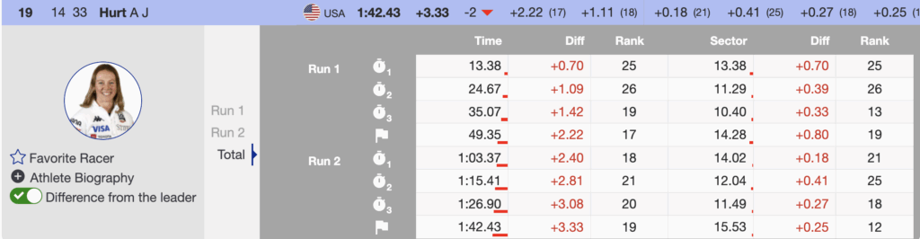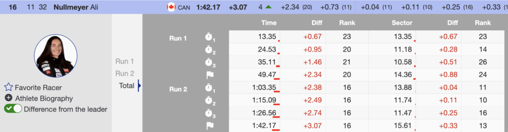 “There were a lot more turns in the second run,” she said. “The offset between the gates was about a meter more, so you’re turning a lot more and the speeds are a little slower. You can control it. I prefer to turn, so it was better for me.”