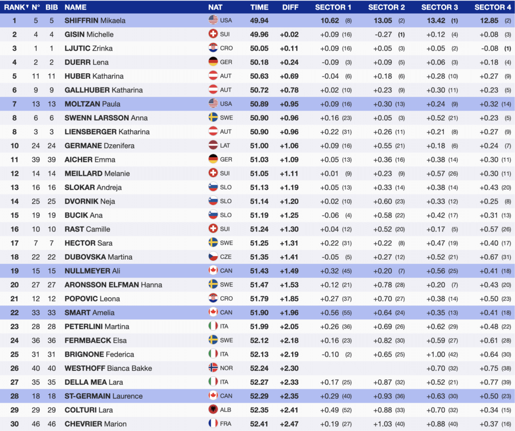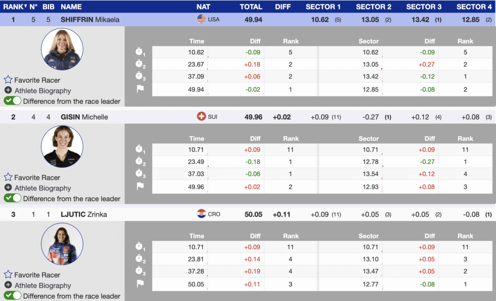 While her lead is only (-0.02) over Switzerland’s Michelle Gisin, seeing her return to the top of the leaderboard was exciting for all the members of the ski racing community. Only (+0.11) behind is Croatian Zrinka Ljutic. Nine women are within a second of the season’s discipline leader, Shiffrin. The fastest ten are separated by only (+1.06).