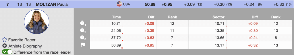 After Shiffrin delivered her run, veteran Paula Moltzan, the next of the Stifel US Ski Team members to attack, skied well throughout the run and ended the morning in 7th (+0.95) behind the leader.